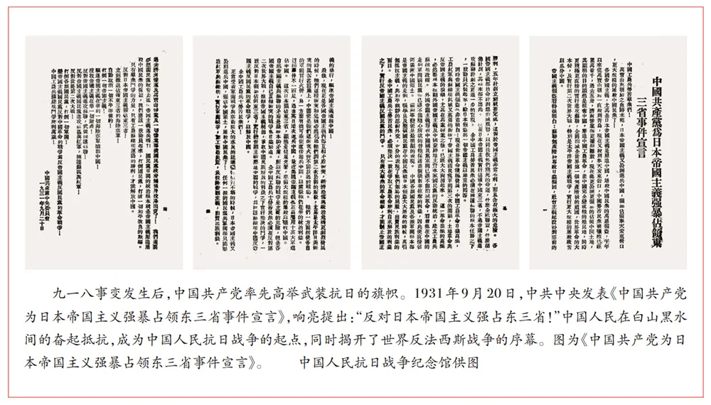 中国共产党自成立之日起就把实现中华民族伟大复兴作为自己的历史使命,捍卫民族独立最坚定、维护民族利益最坚决、反抗外来侵略最勇敢。在争取民族解放的伟大斗争中,中国共产党始终从政治上把握方向、大势、全局,为全民族抗战胜利发挥了不可替代的重要引领作用。面对穷凶极恶的日本军国主义侵略者,我们党在民族危亡的历史关头率先高举武装抗日旗帜。基于对政治形势的科学分析,作出了日本帝国主义同中华民族的矛盾上升为主要矛盾的重大判断。纵观抗战全过程,无论是领导东北抗日联军顽强抵抗,还是广泛开展抗日救亡运动,无论是倡导建立抗日民族统一战线,还是确立全面抗战路线,我们党始终勇立潮头挺膺担当,以强有力的政治领导推动形成了全民族抗战的历史洪流。以毛泽东同志为主要代表的中国共产党人,在推进马克思主义中国化的进程中,把指导抗战实践作为理论创新的重要源泉,以深远的战略眼光和高超的政治智慧确立了党在抗战时期的方针、任务和政策,为抗战胜利提供了科学指引。